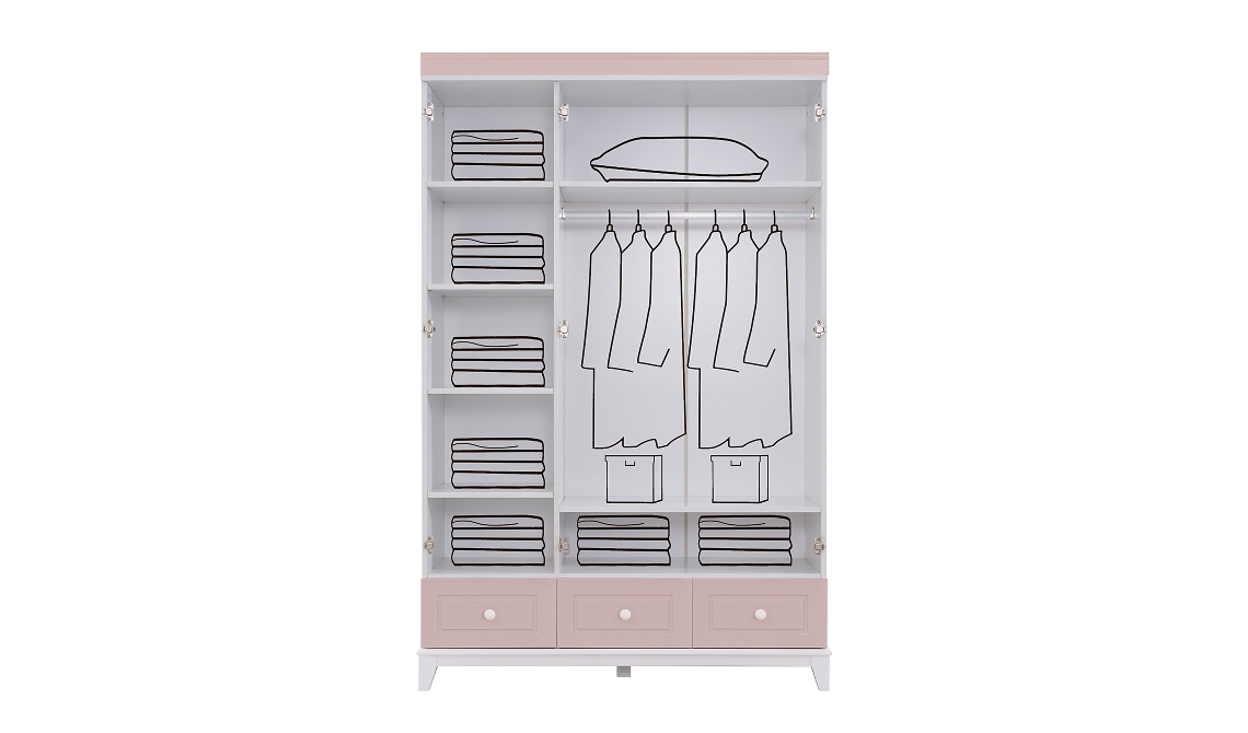 City pembe dolap, zarif renk tonu ve fonksiyonel iç düzeniyle çocuk ve genç odalarında şık ve düzenli bir depolama alanı sunar.