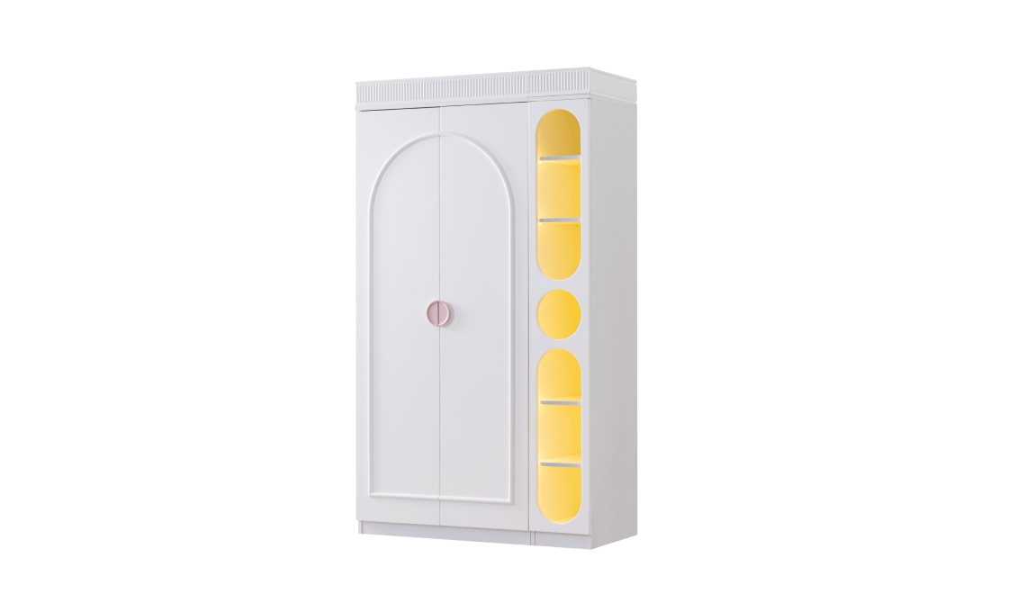 Dolunay pembe dolap, zarif renk tonu ve kullanışlı iç düzeniyle çocuk ve genç odalarında şık ve düzenli bir depolama alanı sunar.