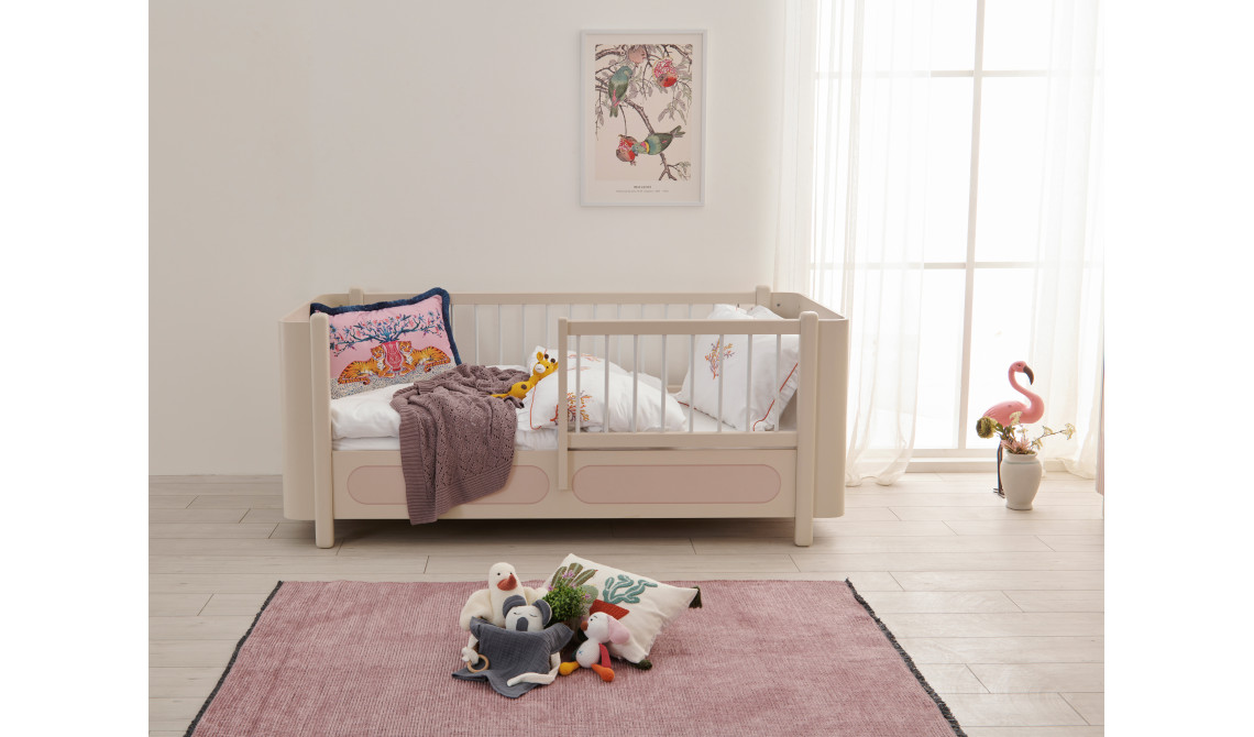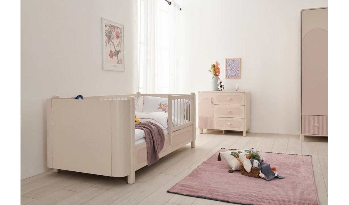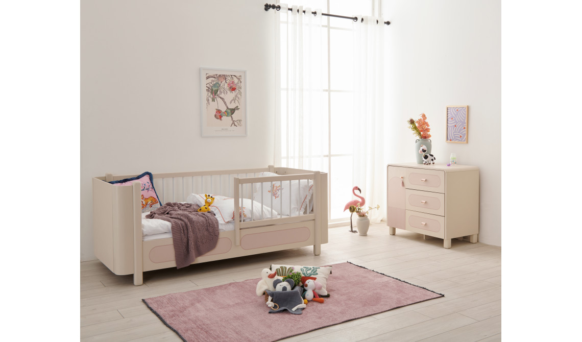 Alçak yatak formu sayesinde bebeğinizin güvenli ve rahat bir uyku alanına sahip olmasını destekler.