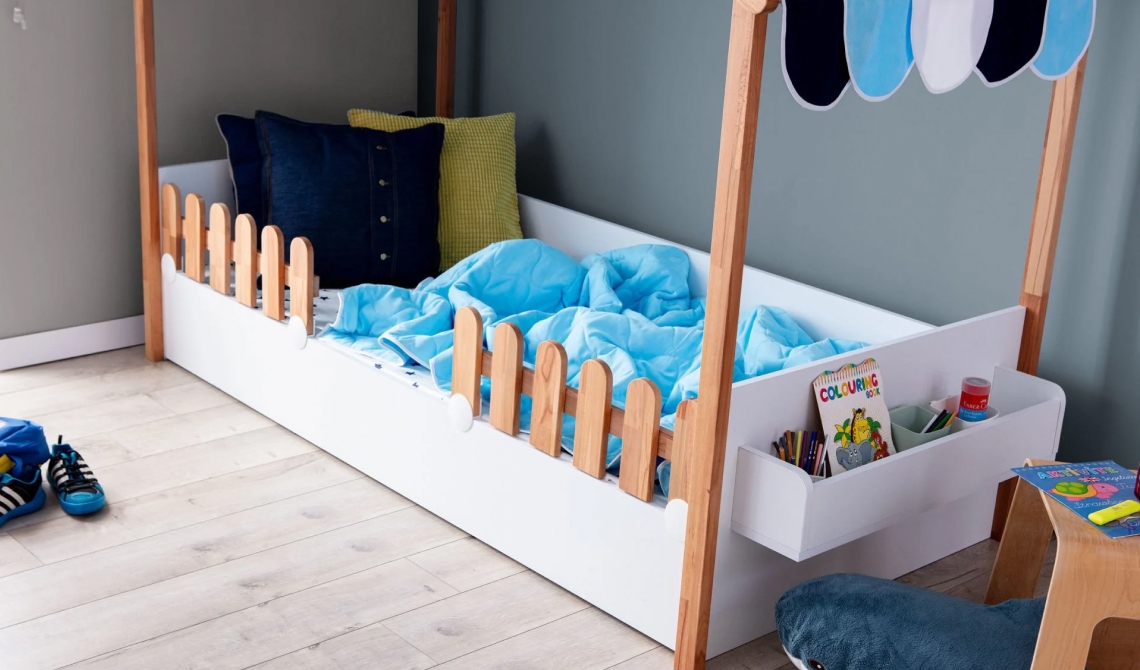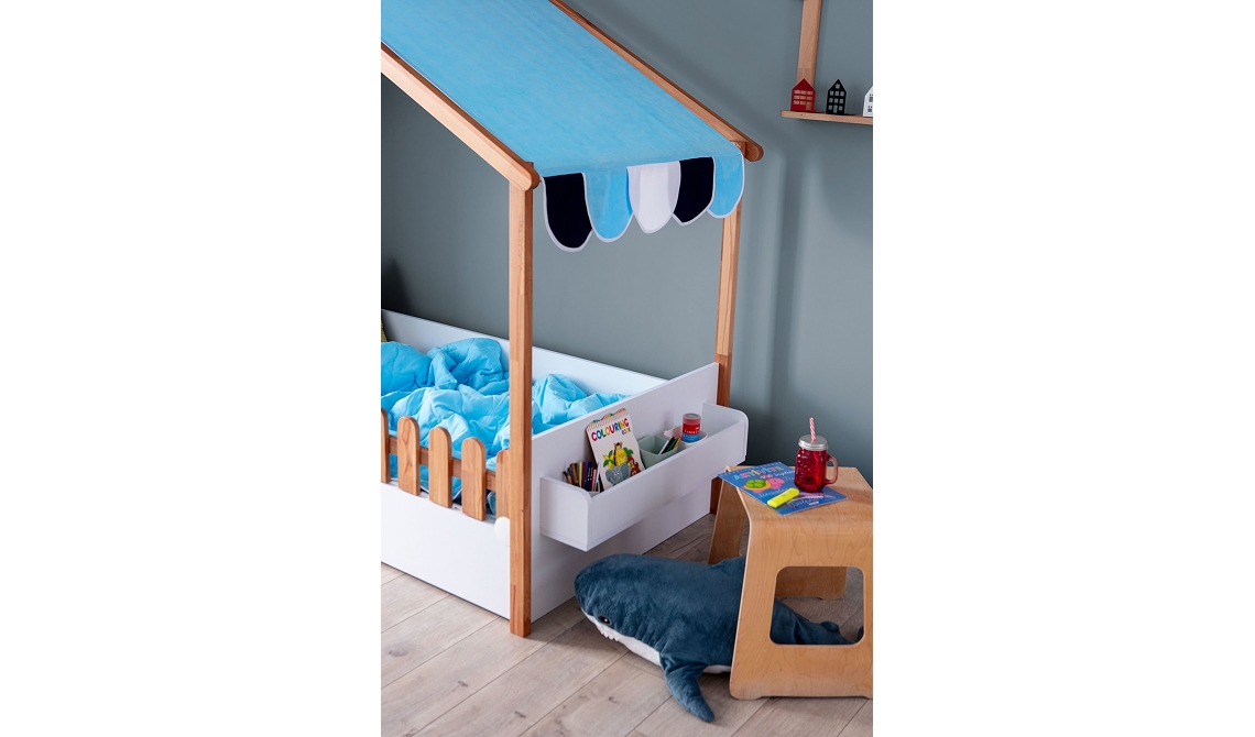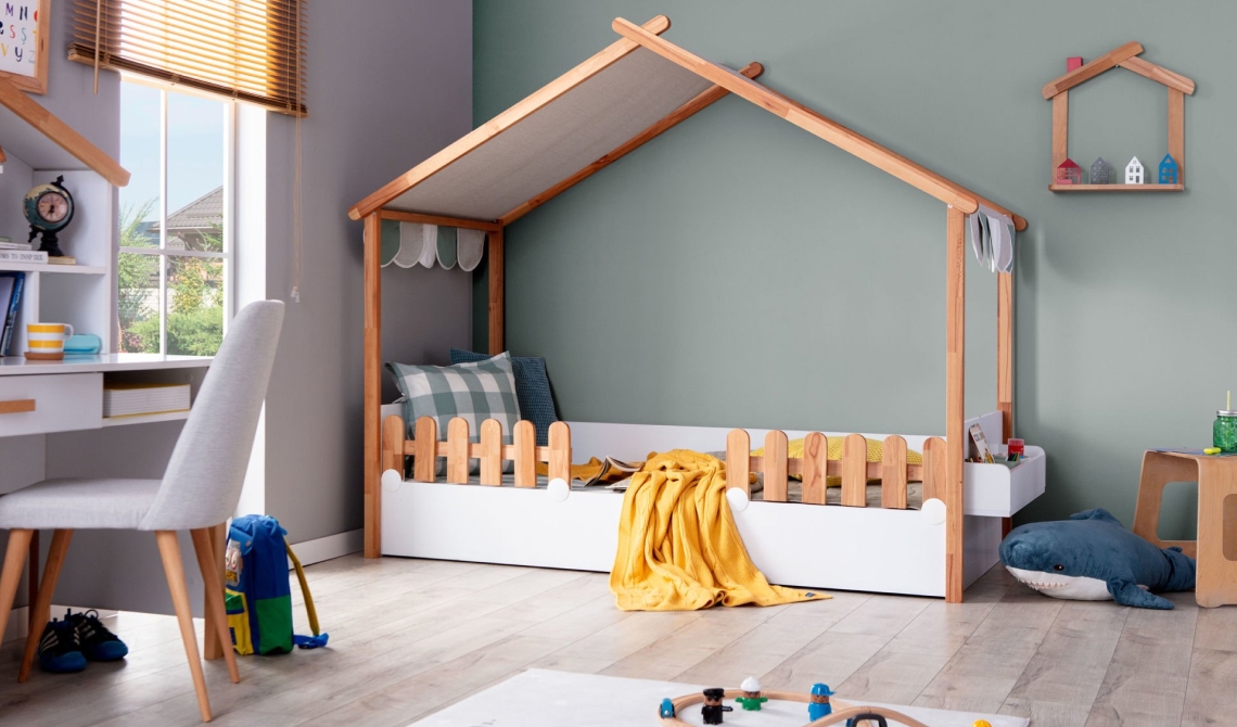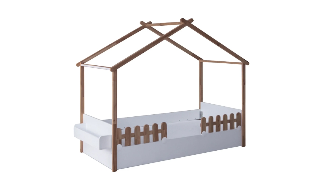 My House New ahşap ev karyola, çocuk odasına doğal, eğlenceli ve güvenli uyku alanı sunar.