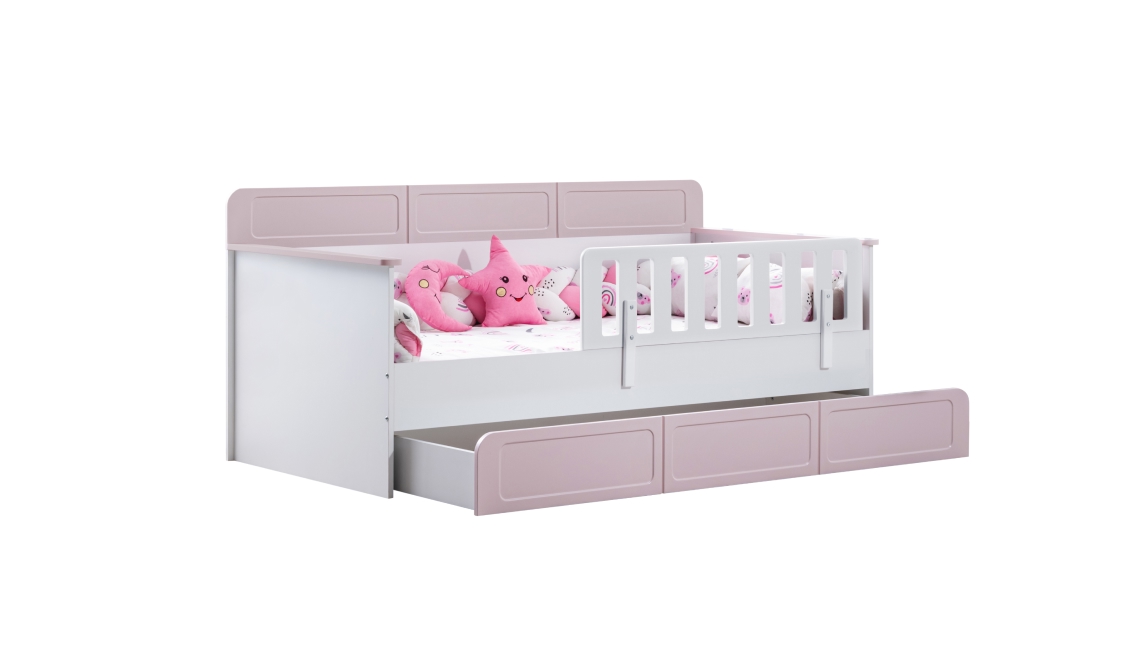 Ömür pembe Montessori karyola, zarif renk tonu ve yere yakın güvenli yapısıyla çocuklar için konforlu ve huzurlu bir uyku alanı sunar.