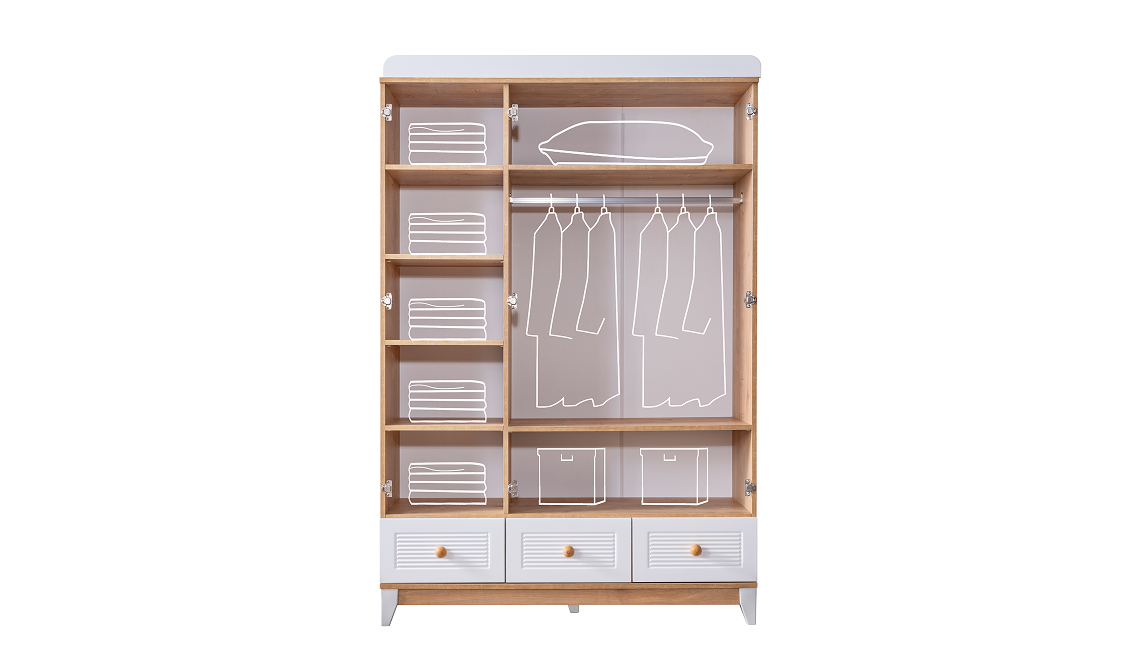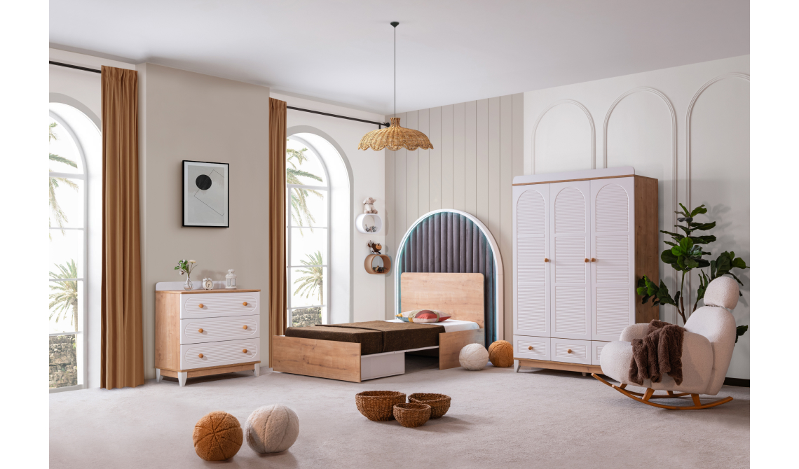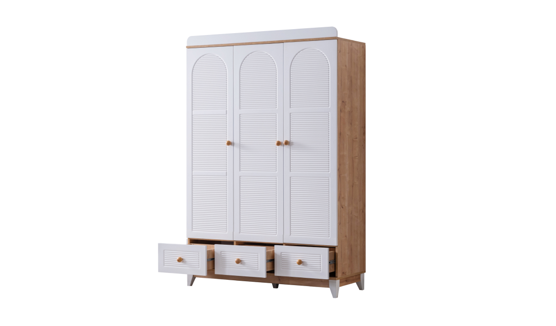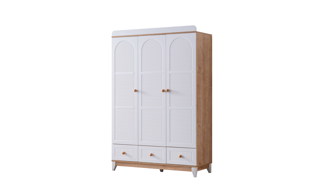Doğal meşe dokusu ve üç kapaklı geniş iç hacmiyle Perla Meşe 3 Kapaklı Dolap, genç odalarında düzeni ve şıklığı bir arada sunar.