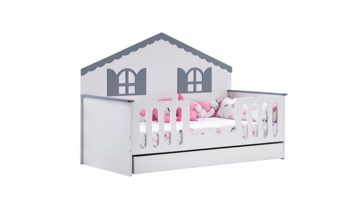 Poli gri Montessori karyola, modern renk tonu ve yere yakın güvenli tasarımıyla çocuklar için konforlu ve fonksiyonel bir uyku alanı sunar.