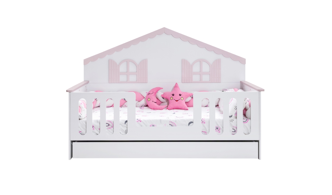 Poli pembe Montessori karyola, zarif renk tonu ve yere yakın güvenli tasarımıyla çocuklar için konforlu ve huzurlu bir uyku alanı sunar.