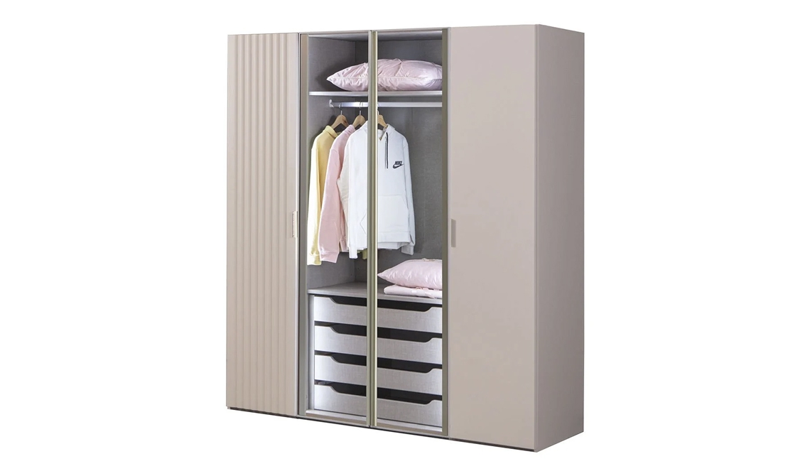 Puzzle Pera 4 kapılı dolap, 2 çekmece ile depolama ve modern şıklık sunar.
