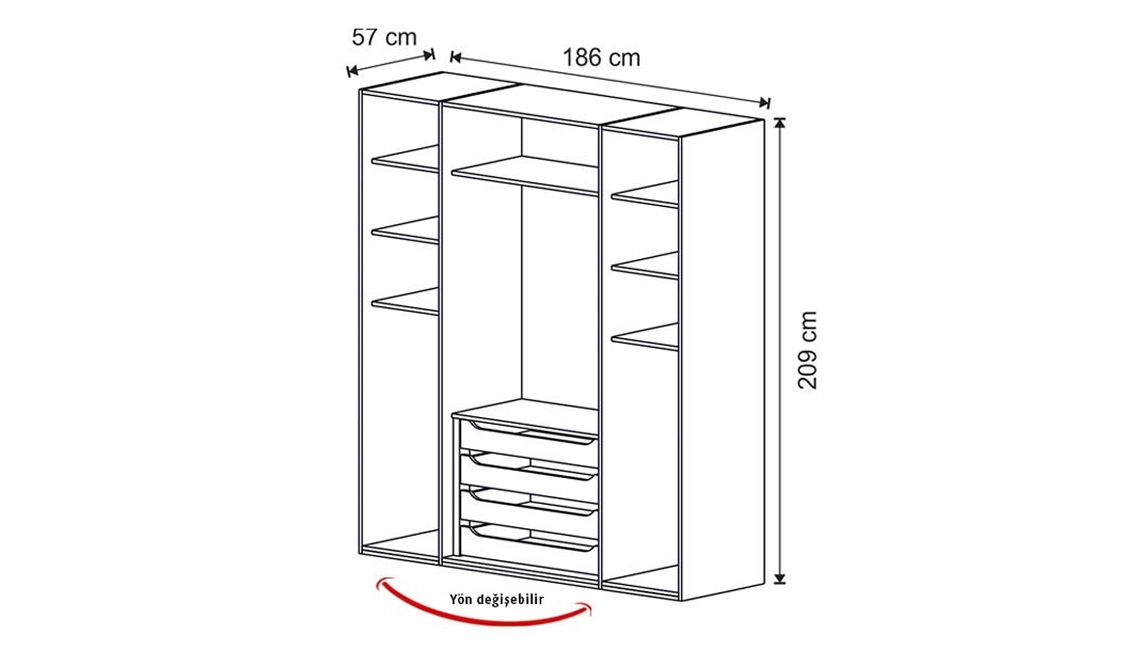 4 Kapılı Dolap (İç Çekmece) 186 cm 57 cm 209 cm