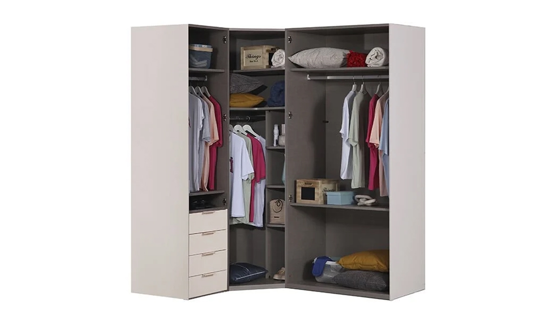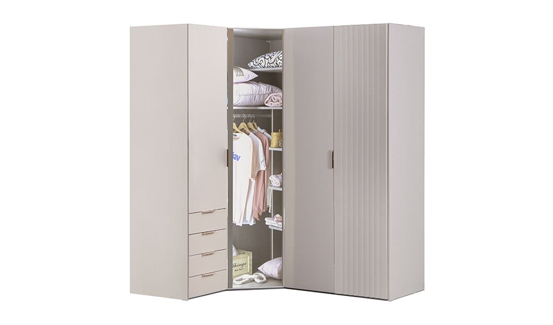 Puzzle Pera 4 kapılı köşe dolap, alanı verimli kullanır ve odanıza şık düzen katar.