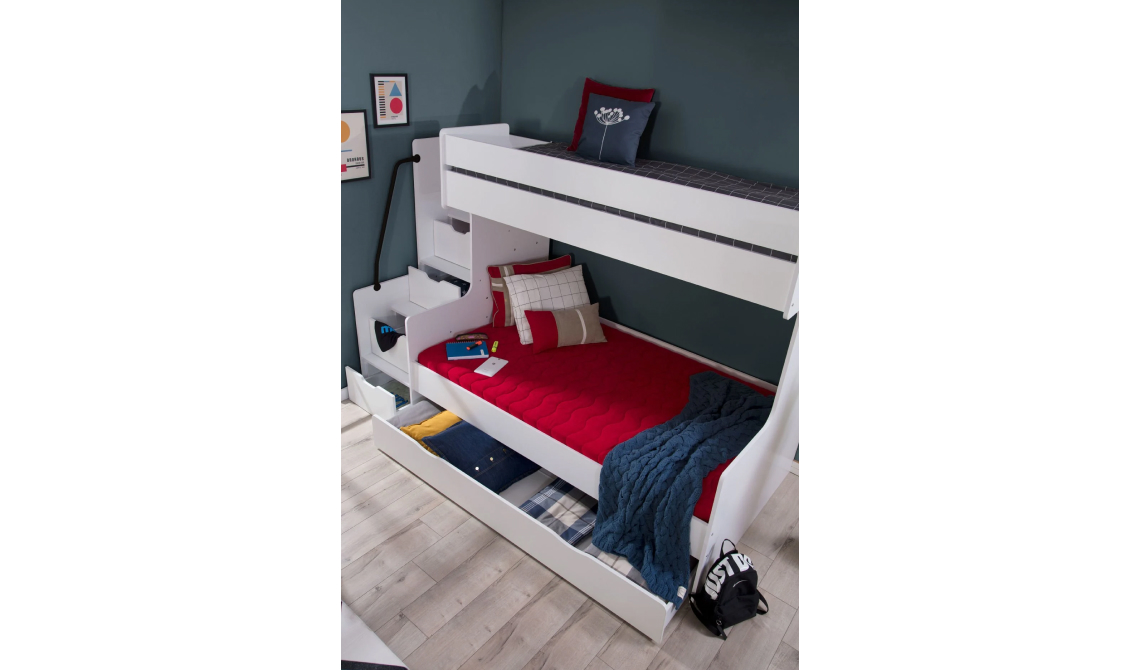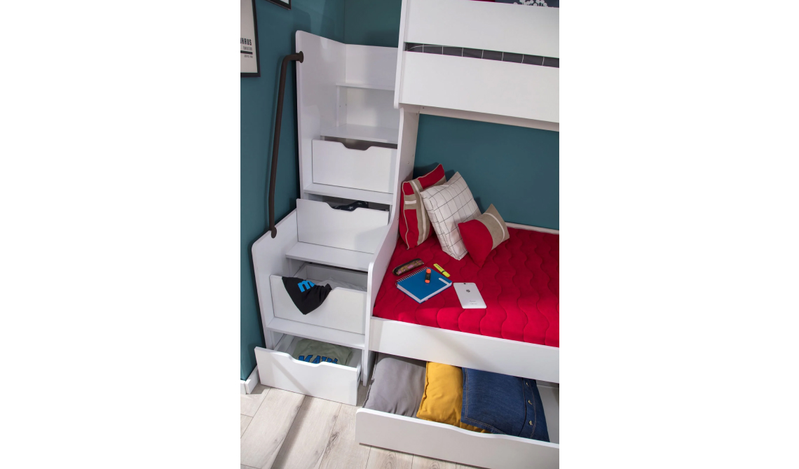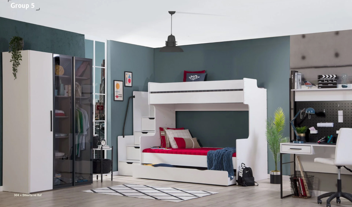 Çekmeceli Ranza Beyaz Siyah fonksiyonel çekmeceli yapısı saglam konstruksiyonu ve modern renk uyumuyla cocuk ve genc odalarında hem yer tasarrufu hem de düzen saglar