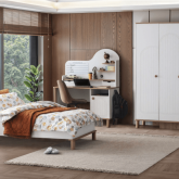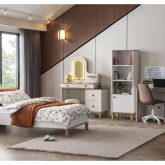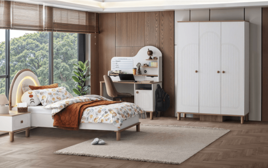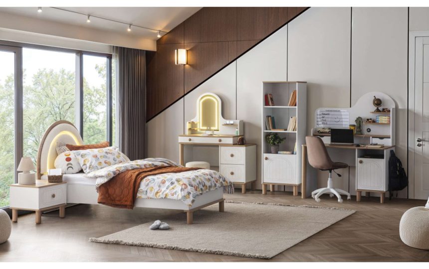 Bohem tarzı detaylarla tasarlanmış bu genç odası, özgün renk ve dokularıyla gençlerin kişisel tarzlarını ifade edebilecekleri rahat ve şık bir yaşam alanı sunar.