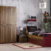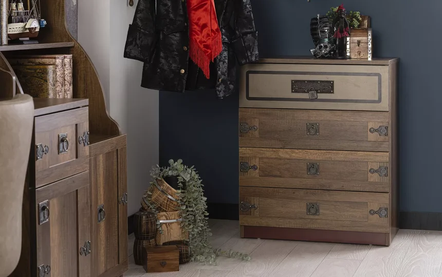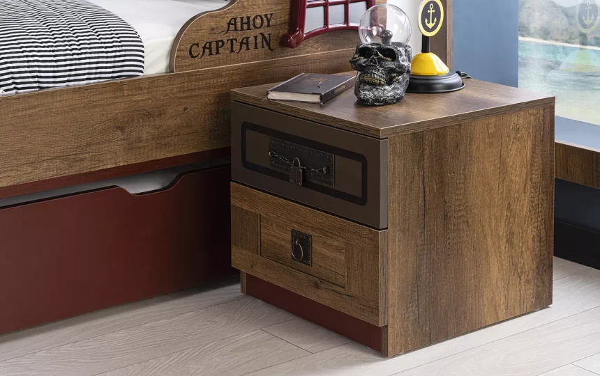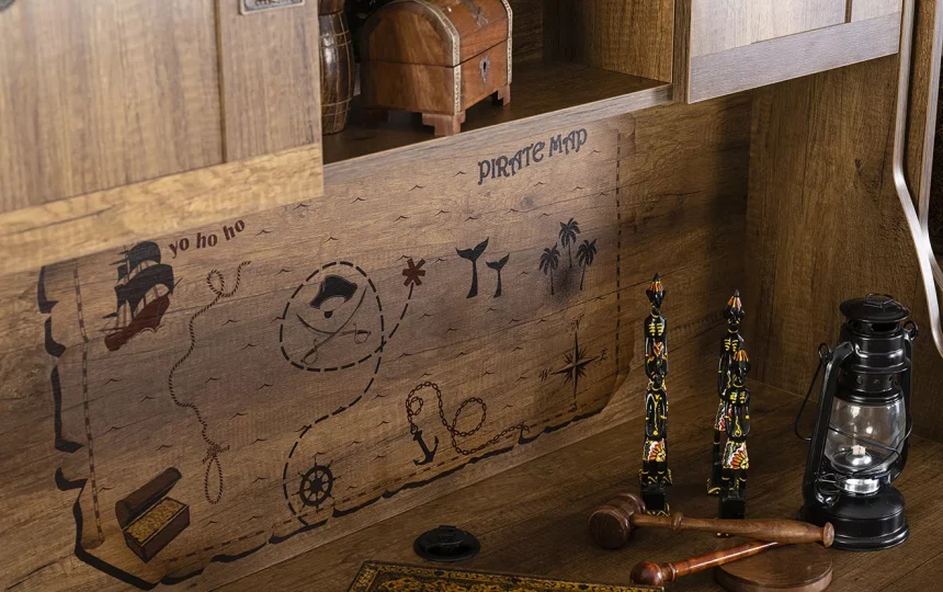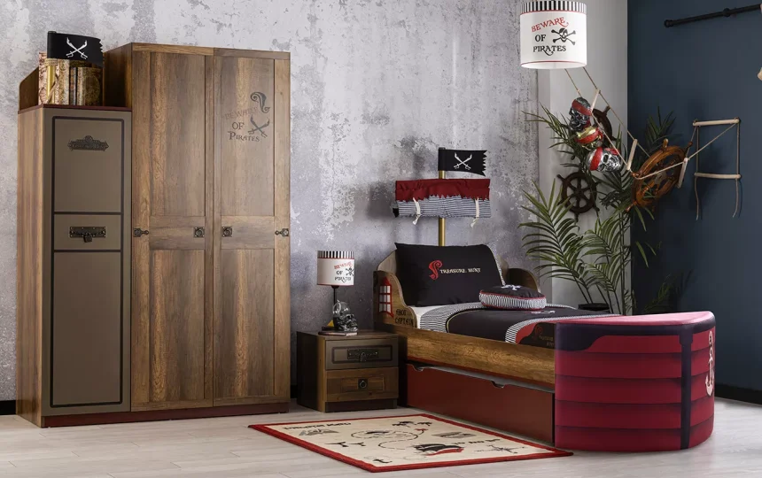 Korsan çocuk odası. Göz alıcı tasarımı ve gemi konsepti ile korsan karyola sınıfında birinci seçenek olmayı hak ediyor. Ürünümüz siz değerli tüketicilerimizin sağlığı ve yaşam kalitesini artırmak için ahşabın sıcak renklerini teknoloji ile buluşturan Uv dijital baskılar ve melamin kaplı yonga levhalardan oluşmakta olup TS EN Kalite sistemi (E1) ve UKS Kalite Belgesi ile üretilmiştir. UV dijital baskılı detaylar kullanılmıştır. Metal eskitme kulplar ile zenginleştirilmiştir.