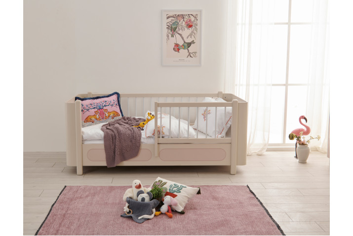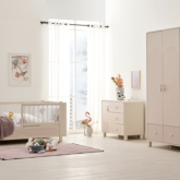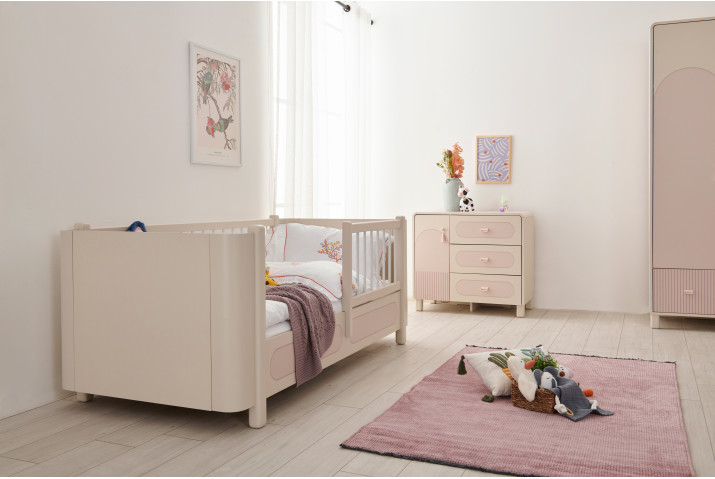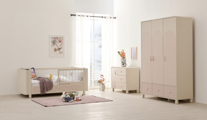 Yumuşak ve huzurlu tonlarla tasarlanmış bu bebek odası, hem güvenli hem de konforlu bir ortam sunarak miniklerin keyifli ve rahat bir yaşam alanına sahip olmasını sağlar.