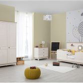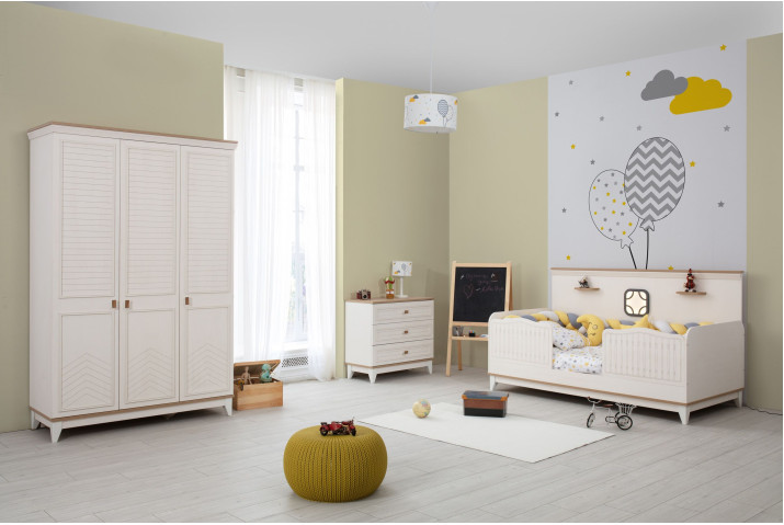 Doğal dokular ve sıcak tonlarla tasarlanmış bu bebek odası, güvenli ve rahat bir ortam sağlayarak miniklerin huzurlu ve keyifli bir yaşam alanına sahip olmasını mümkün kılar.